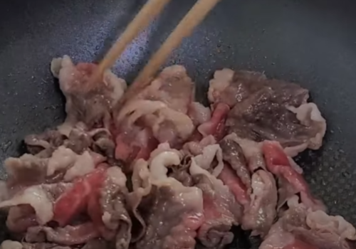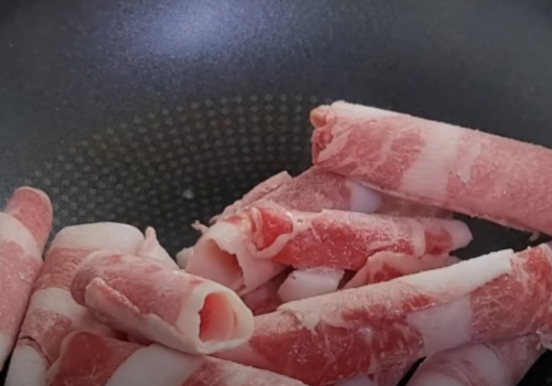 달달 달군팬에 차돌박이를 넣고 살짝 구워준뒤 가위로 먹기 좋게 잘라줍니다.