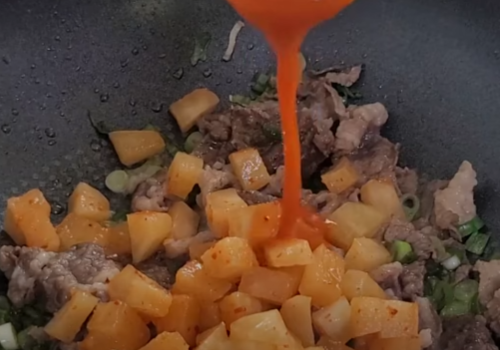이제 잘게 썰어둔 깍두기와 깍두기 김치국물도 함께 넣어주세요
