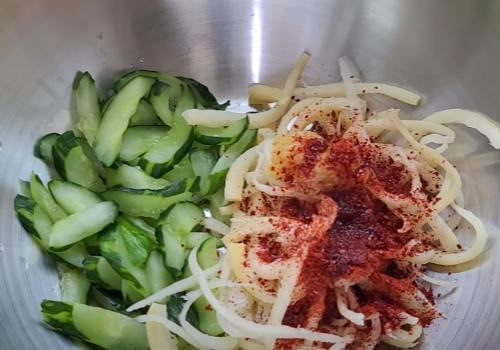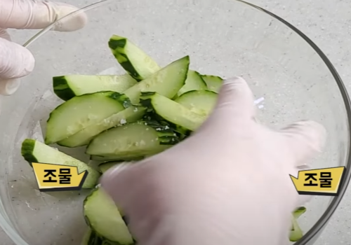 도라지쓴맛을 제거하는 동안 오이 1개도 어슷썰기 해서 꽃소금 1작은술을 넣고 바락바락 치댄 후 절여줍니다.
