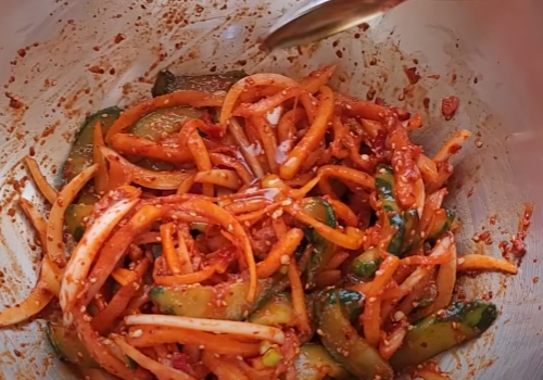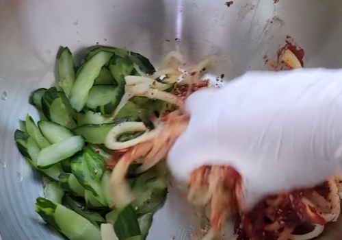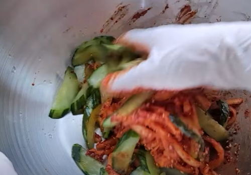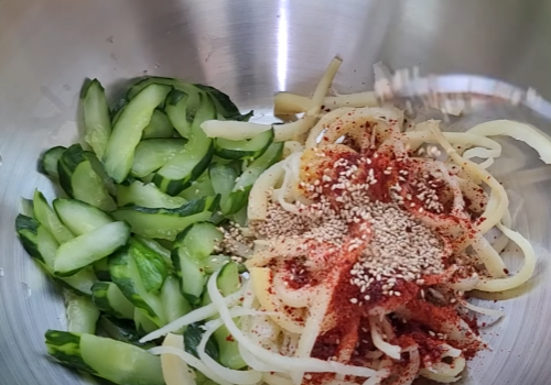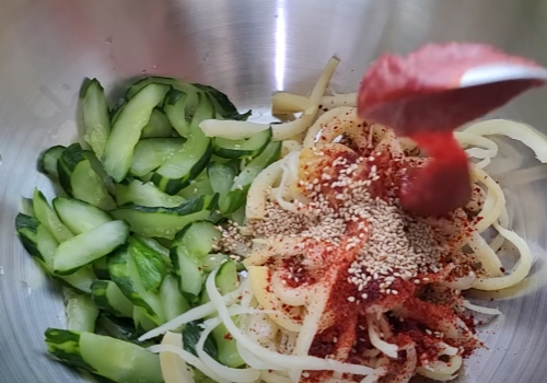 도라지 양념이 골고루 묻히면 오이를 후다닥 버무려주세요