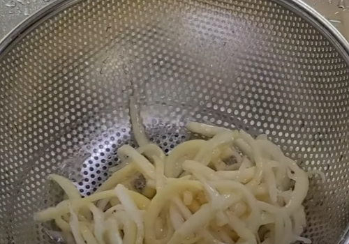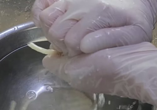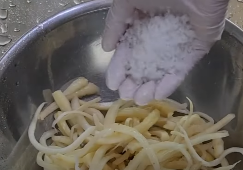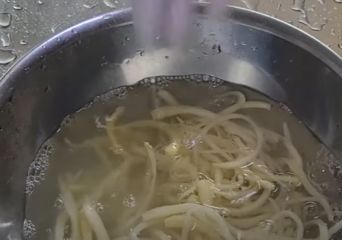열심히 치댄 도라지의 쓴맛을 제거하기 위해 소금물에 20분간 그대로 두세요
