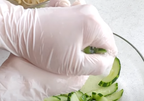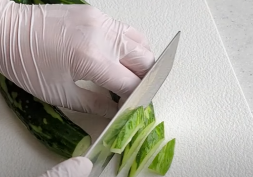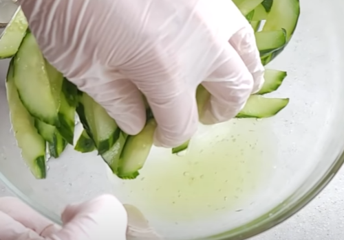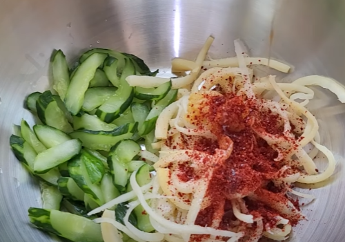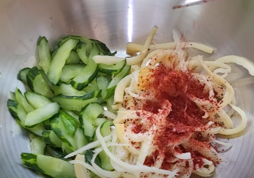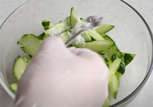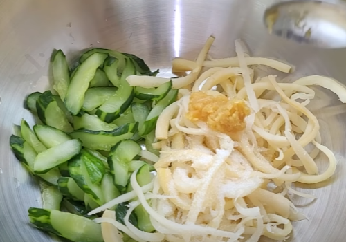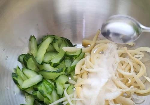 도라지쓴맛을 제거하는 동안 오이 1개도 어슷썰기 해서 꽃소금 1작은술을 넣고 바락바락 치댄 후 절여줍니다.