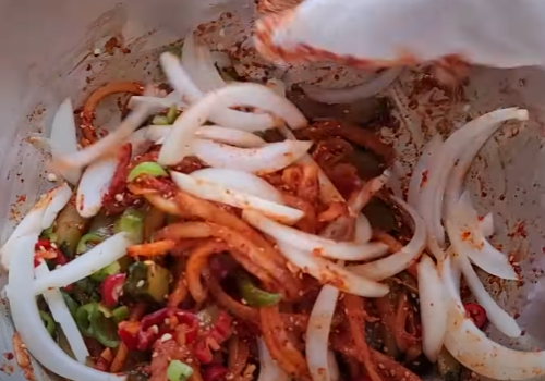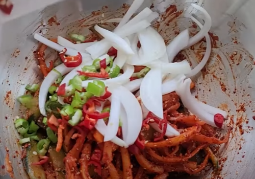 이제 나머지 썰어둔 재료를 함께 넣은 후 다시 한번 버무려 준 뒤 도라지 하나의 간을 봅니다.