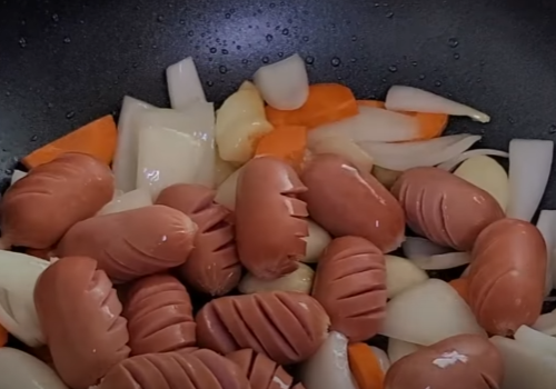 당근이 어느정도 익어갈 때쯤 소시지와 나머지 재료들을 함께 넣어줍니다.