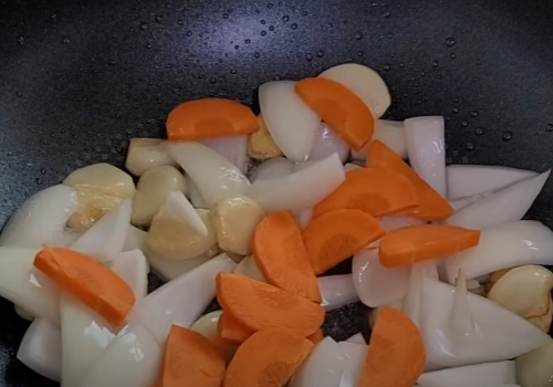마늘이 어느 정도 노릇노릇 익으면 양파와 당근을 차례로 넣고 같이 볶아줍니다.