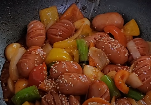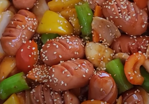 마지막으로 통깨를 솔솔 뿌려주면 정말 먹음직스러운 소시지야채볶음이 완성되었습니다.!!