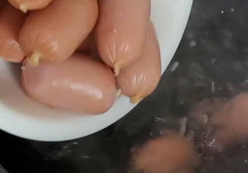 끓는 물에 칼집을 낸 소시지를 넣고 30초 정도 짧게 삶아줍니다.