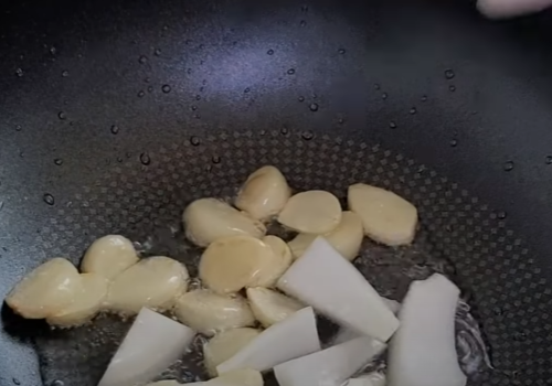 마늘이 어느 정도 노릇노릇 익으면 양파와 당근을 차례로 넣고 같이 볶아줍니다.