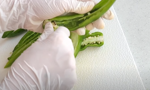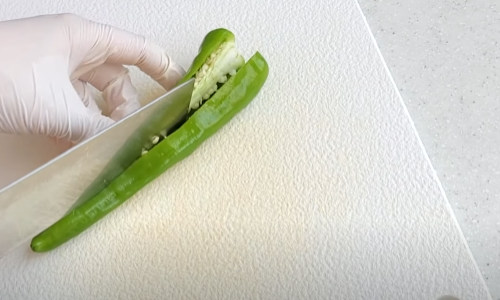 오이고추 5개를 절반으로 잘라서 속에 씨를 빼내주세요.