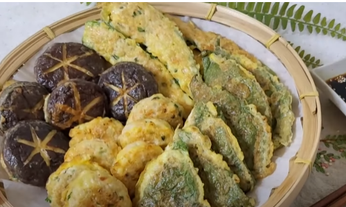 돼지고기 다짐육 570g, 달걀 5개, 양파 1개, 쪽파 100g, 송고버섯 6개, 당근 1/2개, 두부 1모, 오이고추 5개, 깻잎 10장, 다진 마늘 1큰술, 생강 조금, 맛술 2큰술, 소금 1/2큰술, 진간장 1큰술, 후추, 부침가루, 식용유
