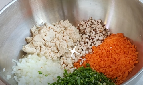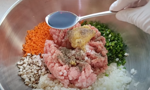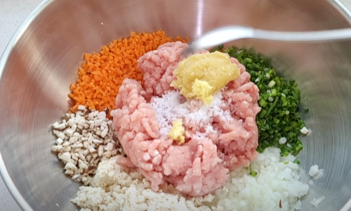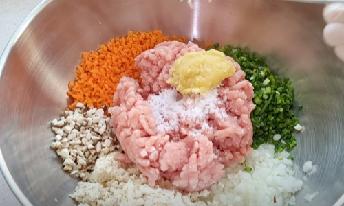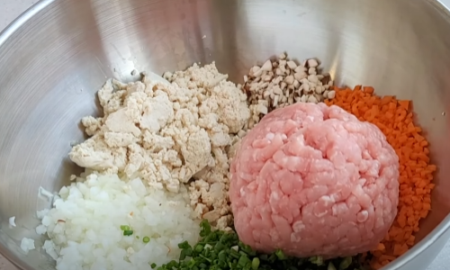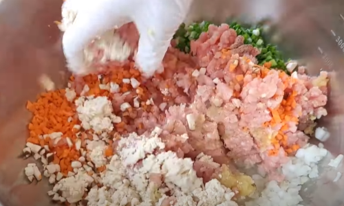 잘게 다진 재료들을 볼에 넣은후 돼지고기 다짐육 570g을 함께 넣어주세요