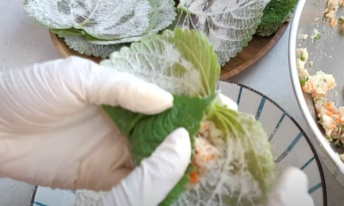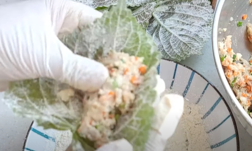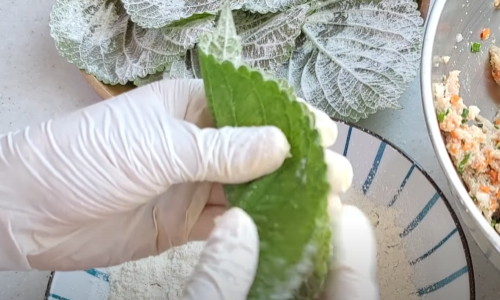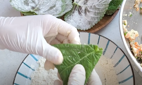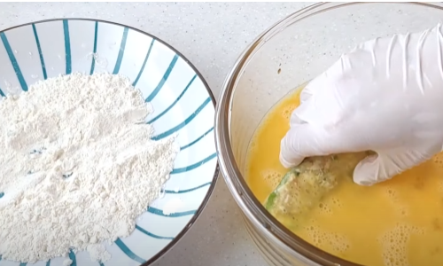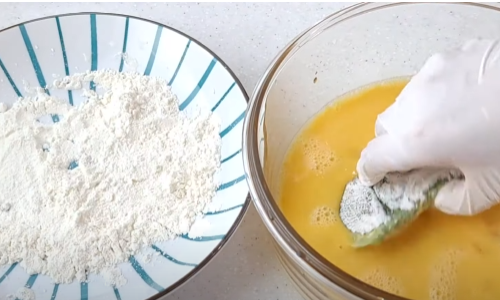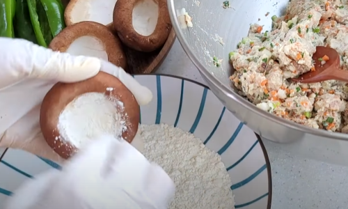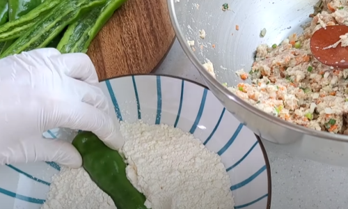 속을 빼낸 오이고추 안쪽에도 부침가루를 묻힌 후 재료를 채워줍니다.