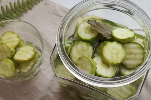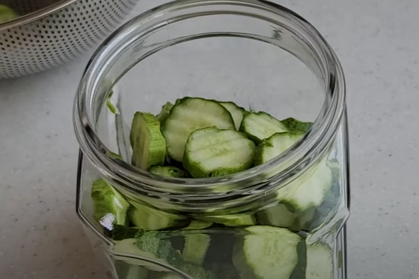 - 무늬칼로 오이를 도톰하게 썰어준 뒤 소독한 유리병에 담아 주세요