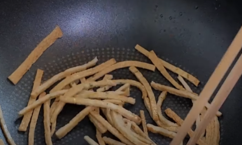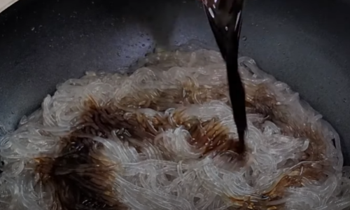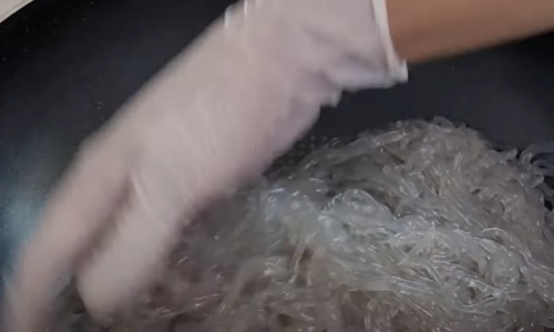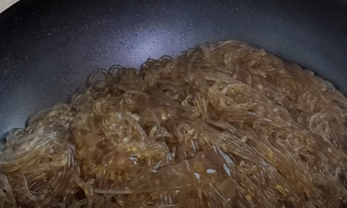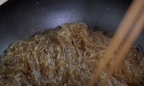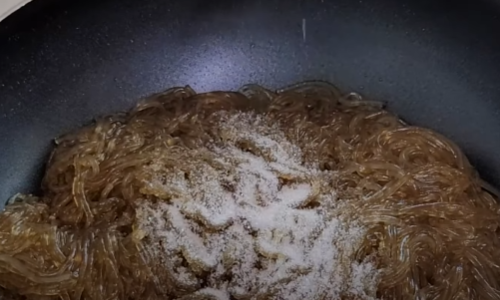 팬에 당면은 넣고 식용유를 뿌려 손으로 한번 뒤집어 주세요(당면은 코딩하면 과정입니다)