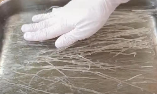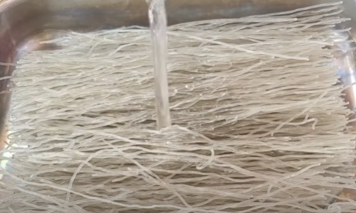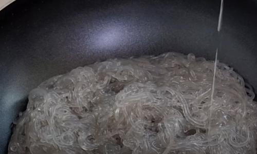 5분 후 익은 당면을 건져내 찬물에 샤워를 시켜줍니다.
