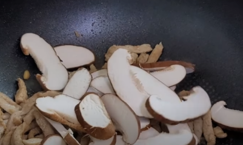 이제 양념된 돼지고기를 달달 볶아준 뒤 거의 익어갈 때쯤 송고버섯도 함께 넣고 볶아줍니다.