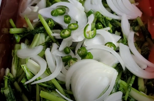 이제 보관용기에 물을 넣은 뒤 열무와 얼갈이 그리고 썰어둔 청양고추와 양파도 함께 넣어주세요.