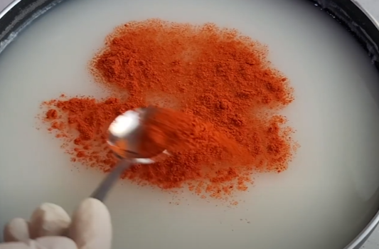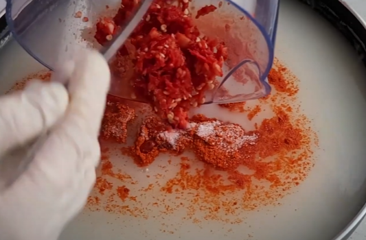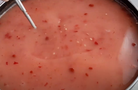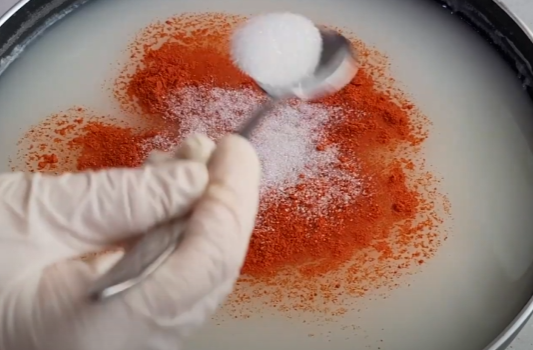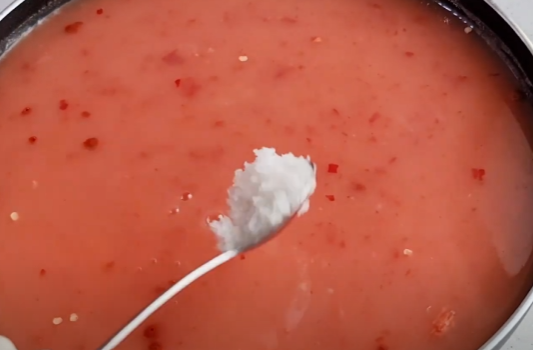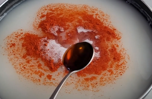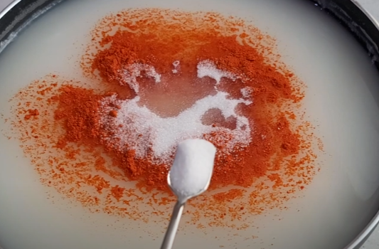 식혀둔 밀가루풀에 고운 고춧가루 1큰술, 설탕 1큰술 반, 맛소금 1작은술