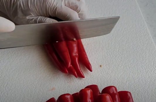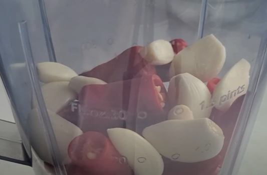 홍고추 9개 워 마늘 12알을 믹서기에 갈아줍니다.