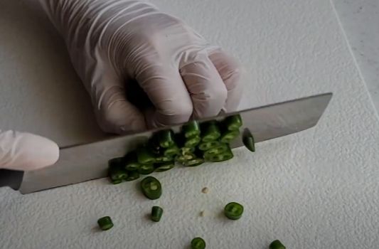 절이는 동안 양파 반 개와 청양고추 3개를 채 썰어주세요