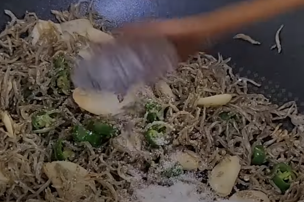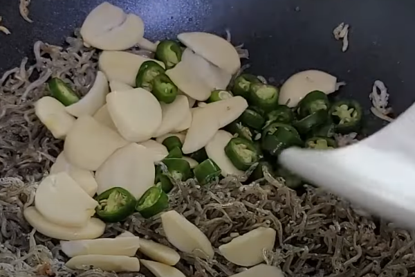 - 청양고추와 마늘을 넣고 함께 볶아줘요.