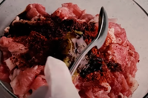 - 재워둔 고기에 고춧가루 3큰술, 다진 마늘 1큰술