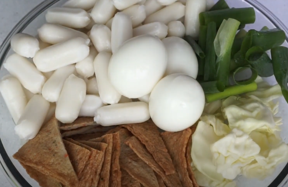 떡 500g 어묵 4장 삶은 계란 3개 양배추 조금 대파 1대 고추장 고춧가루 진간장 설탕 물엿