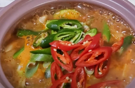 이제 나머지 재료 대파, 청양고추, 홍고추를 전부 넣고 팔팔 끓여주면 정말 맛있는 된장찌개 완성!